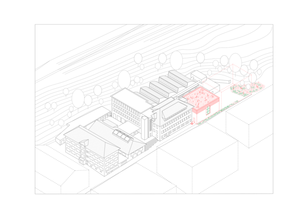 In keeping with the coherence of the existing built ensemble, the new volume is inserted beneath the cornice of the existing building so as not to alter it. Rather than presenting itself as a “black box,” the building seeks to contribute to the revitalization of Rue du Grand-Pré as a public space for social interaction.